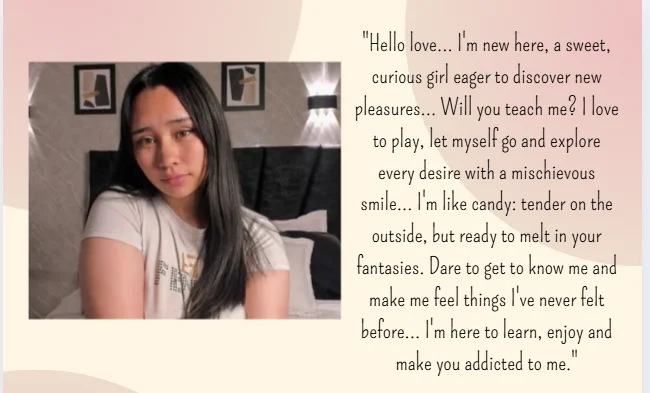 Hello love... l'm new here, a sweet, curious girl eager to discover new pleasures... Will you teach me? I love to play, let myself go and explore every desire with a mischievous smile... I m like candy: tender on the outside, but ready to melt in your fantasies. Dare to get to know me and make me feel things l've never felt before... I'm here to learn, enjoy and make you addicted to me.